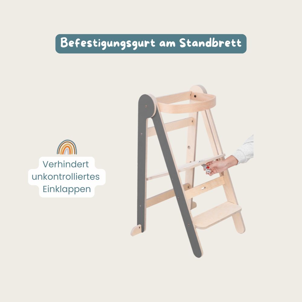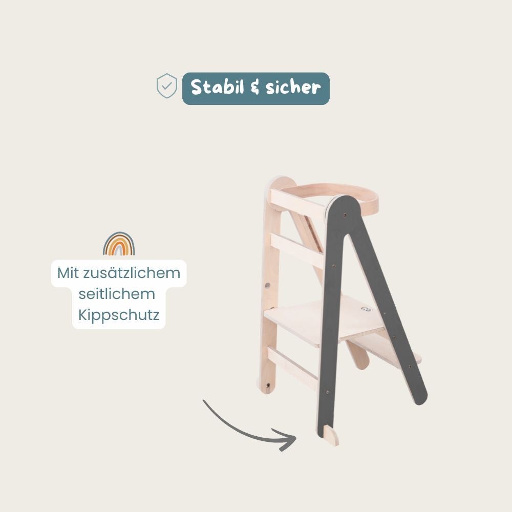 Unser Montessori Lernturm klappbar besticht durch seine stabile und langlebige Bauart, die dir höchste Sicherheit für dein Kind gewährleistet. Wir haben den Lernturm weiter verbessert - durch einen zusätzlichen seitlichen Kippschutz an den Fußenden und einem Einklappschutz durch einen Haltegurt am Standbrett ist eine optimale Sicherheit gewährleistet