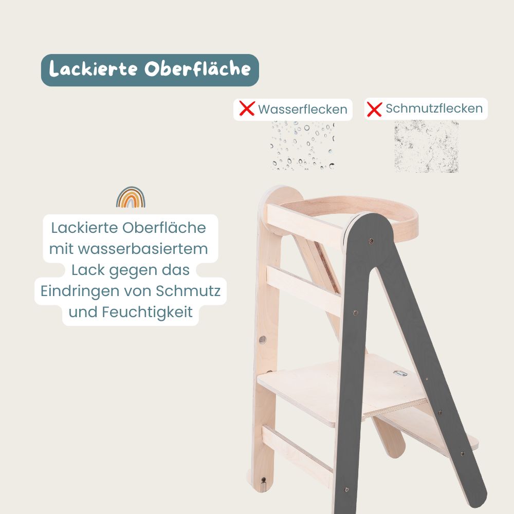 Entdecke unseren Montessori-Lernturm (jetzt im neuen Design - mit zusätzlichem Kippschutz und Klappschutz-Gurt) aus natürlichem, aber mit wasserbasiertem Lack beschichteteten Birkenholz, der perfekt dafür geeignet ist, dein Kind sicher auf Augenhöhe mit dir zu bringen. Ebenso kann der Lernturm auch als Tritt und Steighilfe von den Eltern & Geschwistern genutzt werden.