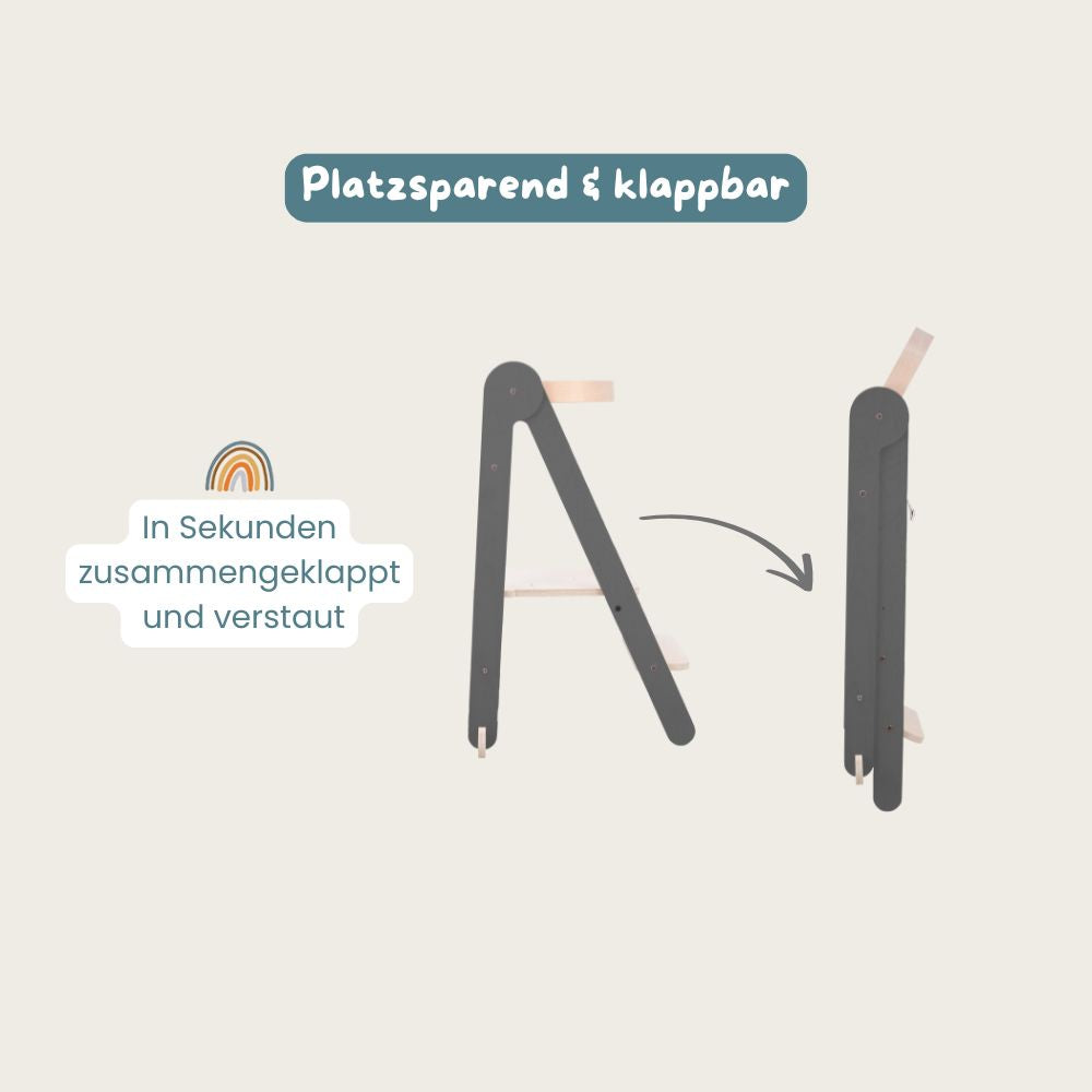 Unser Montessori Lernturm lässt sich praktisch zusammenklappen, sodass er bei Nichtgebrauch einfach und platzsparend verstaut werden kann. Diese flexible Funktion macht ihn zu einem idealen Begleiter in deinem Zuhause, besonders wenn du Wert auf Ordnung und effiziente Raumnutzung legst.