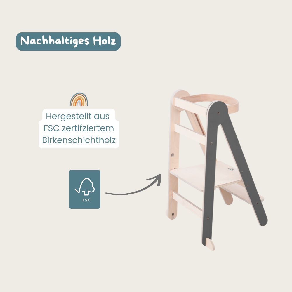 Ein Montessori Lernturm ist ideal für Kinder, da er ihre Unabhängigkeit und Selbstvertrauen fördert, indem er ihnen ermöglicht, auf Augenhöhe mit Erwachsenen zu interagieren und am alltäglichen Geschehen teilzunehmen. Darüber hinaus unterstützt der Lernturm die Entwicklung motorischer Fähigkeiten und bietet eine sichere Umgebung, in der Kinder ihre Umwelt erkunden und spielerisch lernen können. Der Lernturm kann schnell und einfach zusammengeklappt und verstaut werden - optimal für Eltern, die nicht so viel Platz zuhause haben.