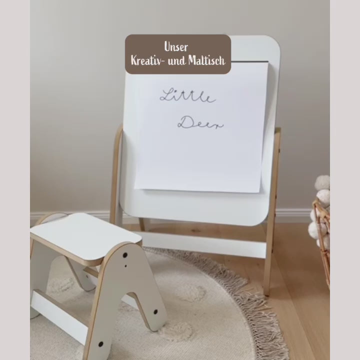 Entdecke unseren Kreativ- und Maltisch, das Tor zur kreativen Welt deines Kindes. Der multifunktionale Kreativtisch verwandelt sich im Handumdrehen von einem flachen Maltisch in eine inspirierende Staffelei. Der höhenverstellbare Stuhl wächst mit deinem kleinen Künstler mit, begleitet seine ersten Striche und unterstützt seine wachsenden Fähigkeiten. Und für endlose Kreativität? Füge eine optional integrierbare Papierrolle hinzu, auf der dein Kind seine bunten Träume und wildesten Fantasien ausdrücken kann. Mit unserem Mini-Atelier wird jeder Tag zu einem Abenteuer in Farbe und Form